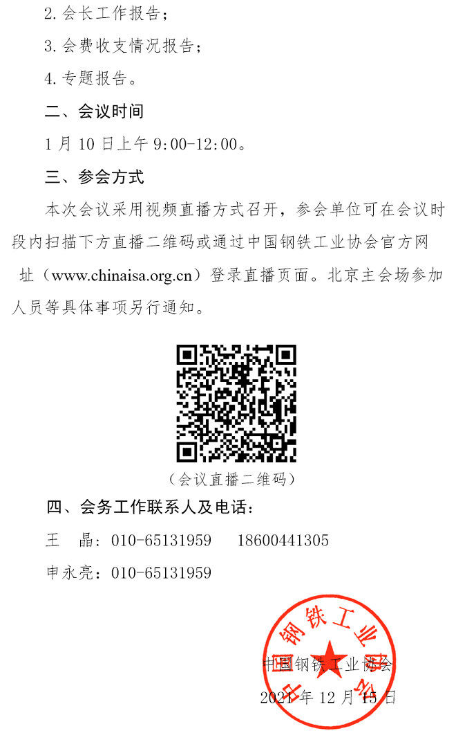 1月10日上午9:00,中zhong國guo鋼gang鐵tie工gong業ye協xie會hui第di六liu屆jie會hui員yuan大da會hui三san次ci會hui議yi即ji將jiang召zhao開kai。本ben次ci會hui議yi將jiang通tong過guo視shi頻pin的de形xing式shi召zhao開kai,北bei京jing設she主zhu會hui場chang。屆jie時shi,我wo們men將jiang通tong過guo鋼gang協xie微wei信xin公gong眾zhong號hao和he官guan方fang網wang站zhan