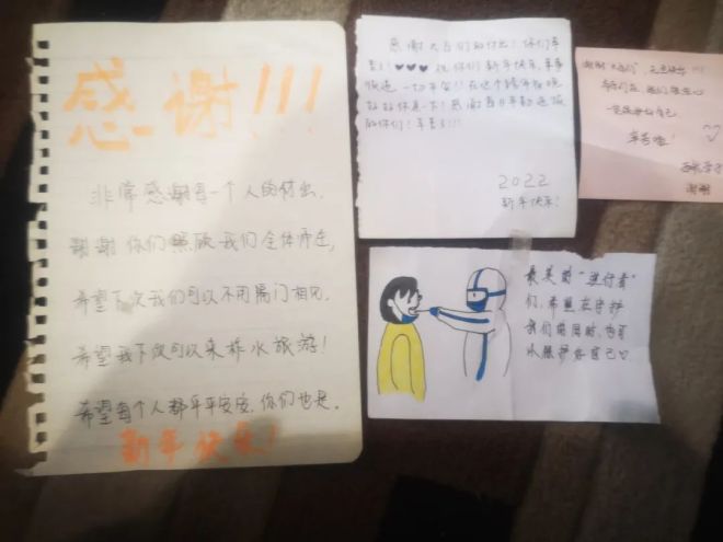 累了就席地小憩,緩衝體力後,再次爭分奪秒與疫情“賽跑”,時(shi)刻(ke)堅(jian)守(shou)在(zai)疫(yi)情(qing)防(fang)控(kong)第(di)一(yi)線(xian)。大(da)家(jia)日(ri)複(fu)一(yi)日(ri)用(yong)汗(han)水(shui)守(shou)護(hu)著(zhe)每(mei)一(yi)位(wei)住(zhu)客(ke)的(de)健(jian)康(kang),用(yong)熱(re)情(qing)周(zhou)到(dao)的(de)服(fu)務(wu)贏(ying)得(de)了(le)大(da)家(jia)的(de)認(ren)可(ke)和(he)表(biao)揚(yang),收(shou)獲(huo)了(le)很(hen)多(duo)來(lai)自(zi)住(zhu)客(ke)的(de)滿(man)滿(man)愛(ai)意(yi)。客(ke)人(ren)在(zai)房(fang)間(jian)門(men)口(kou)留(liu)下(xia)一(yi)張(zhang)張(zhang)紙(zhi)片(pian),寫(xie)滿(man)了(le)感(gan)謝(xie)的(de)話(hua)語(yu)和(he)新(xin)年(nian)的(de)祝(zhu)福(fu),都(dou)溫(wen)暖(nuan)著(zhe)每(mei)一(yi)位(wei)員(yuan)工(gong)的(de)心(xin)。