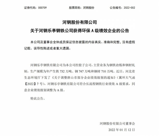 1月12日,河鋼股份發布公告稱,河鋼樂亭鋼鐵公司(即河鋼唐鋼新區)被河北省生態環境廳調整為環保A級績效企業。