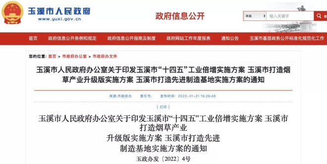 2022年1月21日,玉溪市人民政府網站發布了《關於印發玉溪市“十四五”工業倍增實施方案 玉溪市打造煙草產業升級版實施方案 玉溪市打造先進製造基地實施方案的通知》(以下簡稱“《通知》”)。