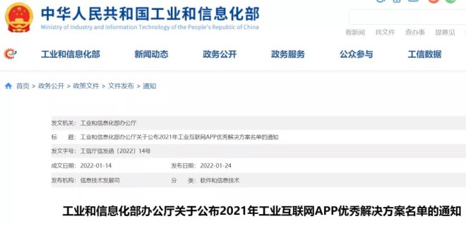 1月24日,工業和信息化部網站發布通知:為貫徹落實國務院《關於深化“互聯網+先進製造業”發展工業互聯網的指導意見》,按照《工業和信息化部辦公廳關於開展2021年工業互聯網APP優秀解決方案征集遴選工作的通知》(工信廳信發函〔2021〕224號)要求,經單位推薦、專家評審、網上公示,確定了132個解決方案為2021年工業互聯網APP優秀解決方案,現予以公布。請各地區、各有關單位加大支持力度,積極推動工業互聯網APP優秀解決方案應用推廣。