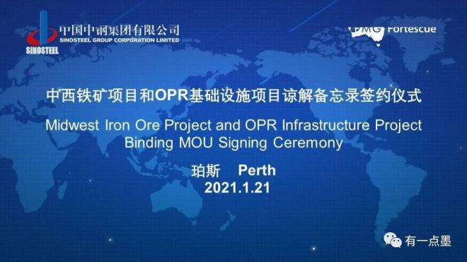 2022年1月21日,中鋼集團與世界第四大鐵礦生產商FMG集(ji)團(tuan)在(zai)澳(ao)大(da)利(li)亞(ya)珀(po)斯(si)舉(ju)行(xing)了(le)西(xi)澳(ao)中(zhong)西(xi)部(bu)地(di)區(qu)鐵(tie)礦(kuang)項(xiang)目(mu)合(he)作(zuo)諒(liang)解(jie)備(bei)忘(wang)錄(lu)簽(qian)約(yue)儀(yi)式(shi),為(wei)後(hou)續(xu)合(he)作(zuo)開(kai)發(fa)西(xi)澳(ao)中(zhong)西(xi)部(bu)地(di)區(qu)鐵(tie)礦(kuang)及(ji)配(pei)套(tao)基(ji)礎(chu)設(she)施(shi)奠(dian)定(ding)基(ji)礎(chu)。中鋼集團董事、總經理劉安棟在京以視頻連線方式見證簽約。