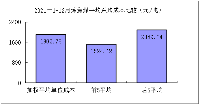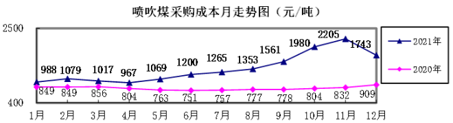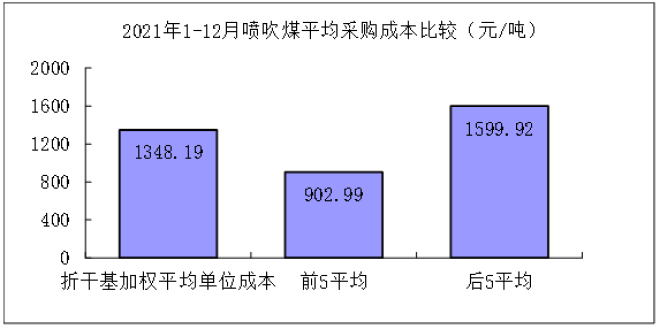 噴吹煤12月份加權平均折算成幹基的采購成本為1743.41元/噸,環比下降461.47元/噸,降幅為20.93%。1-12月累計平均折算成幹基的采購成本為1348.19元/噸,同比升高533.79元/噸,升幅為65.54%。