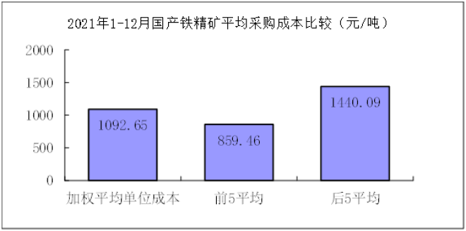 1-12月對標企業國產鐵精礦折算成62%品位的平均采購成本為1092.65元/噸,成本最低的前5家企業的加權平均采購成本為859.46元/噸,比對標企業平均采購成本低233.20元/噸,低於平均采購成本21.34%;而采購成本最高的5家企業的加權平均采購成本為1440.09元/噸,比對標企業平均采購成本高347.44元/噸,高於平均采購成本31.80%。