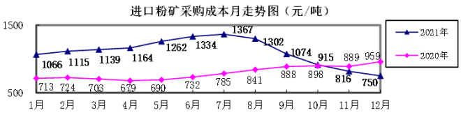 進口粉礦12月份加權平均采購成本750.33元/噸,環比下降65.64元/噸,降幅為8.04%。1-12月累計平均采購成本為1109.36元/噸,同比升高316.40元/噸,升幅為39.90%。