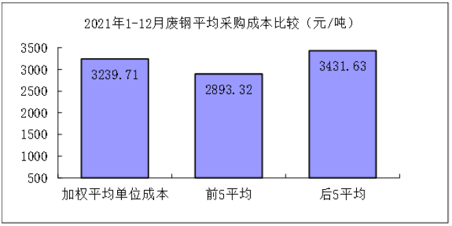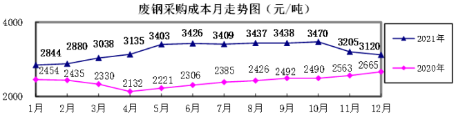 廢鋼12月份加權平均采購成本為3120.29元/噸,環比下降84.21元/噸,降幅為2.63%。1-12月累計平均采購成本為3239.71元/噸,同比升高820.00元/噸,升幅為33.89%。