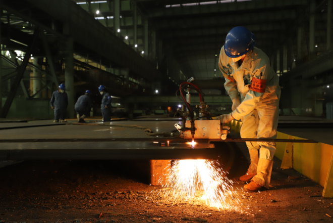 晚wan霞xia和he燈deng光guang齊qi輝hui,勾gou勒le出chu鋼gang城cheng的de流liu光guang溢yi彩cai,有you人ren走zou在zai回hui家jia的de路lu上shang,有you人ren還hai在zai堅jian守shou自zi己ji的de崗gang位wei,在zai厚hou板ban廠chang廠chang房fang,中zhong冶ye寶bao鋼gang厚hou板ban火huo切qie團tuan隊dui的de隊dui員yuan們men,在zai廠chang房fang裏li來lai回hui穿chuan梭suo、在鋼板上反複丈量。