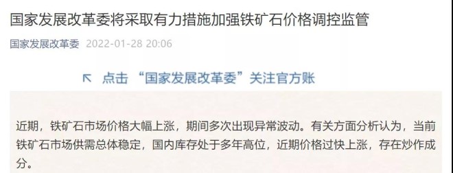 1月28日晚,國家發展改革委官微發布消息,將采取有力措施加強鐵礦石價格調控監管。
