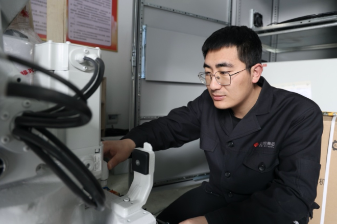 機器人代替人工插拔魚雷罐車電氣插頭是研發人員攻克的首道難關。魚雷罐車啟動電源時對插頭插接精度、速度都有極高的要求。為讓機器人插拔插頭時既快又準,研發人員針對現場可能出現的各種影響因素,經反複研討、論證,確定了“機器人+視覺定位”的解決方案。“借助工業相機為機器人裝上‘火眼金睛’,賦予機器人看的能力,從而實現更加精準的插拔操作。”該公司自動化事業部區域師顏偉介紹,“過去,工人手抱20多公斤重的插頭進行操作至少需要20多分鍾,現在機器人一兩分鍾就幹完了,既安全又高效。”