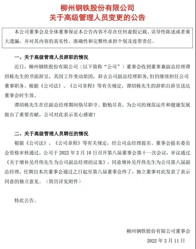 柳鋼股份於2022年2月10日召開第八屆董事會第十一次會議,審議通過《關於增補吳丹偉為公司副總經理的議案》,同意增補吳丹偉為柳鋼股份第八屆副總經理。