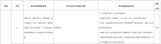 綜合利用的資源名稱、綜合利用產品和勞務名稱、技術標準和相關條件、退稅比例等按照此公告所附《資源綜合利用產品和勞務增值稅優惠目錄(2022年版)》的相關規定執行。其中,廢鋼鐵適用於表內3.5,規定退稅30%政策進一步加嚴,需具備兩個條件: