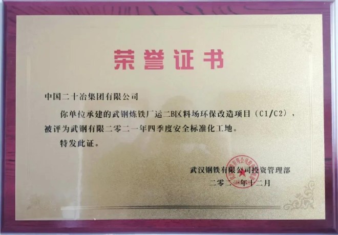 日前,中國二十冶承建的武鋼煉鐵廠運二B區料場環保改造項目(C1/C2)再次獲得武漢鋼鐵有限公司投資管理部頒發的2021年4季度安全標準化工地獎牌證書,這也是該項目自獲得3季度安全標準化工地獎牌證書後又一次用實力贏得的榮譽。
