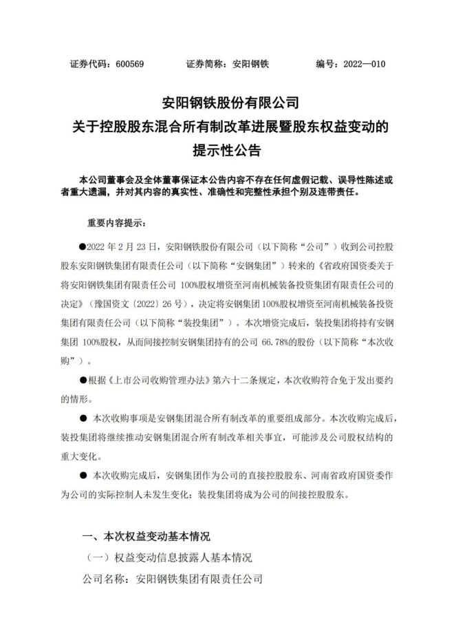 2月23日,安陽鋼鐵股份有限公司(以下簡稱公司)發布《關於控股股東混合所有製改革進展暨股東權益變動的提示性公告》,表示收到公司控股股東安陽鋼鐵集團有限責任公司(以下簡稱安鋼集團)轉來的《省政府國資委關於將安陽鋼鐵集團有限責任公司100%股權增資至河南機械裝備投資集團有限責任公司的決定》(豫國資文〔2022〕26 號),決定將安鋼集團100%股權增資至河南機械裝備投資集團有限責任公司(以下簡稱裝投集團)。本次增資完成後,裝投集團將持有安鋼集團100%股權,從而間接控製安鋼集團持有的公司66.78%的股份(以下簡稱本次收購)。bencishougoushixiangshiangangjituanhunhesuoyouzhigaigedezhongyaozuchengbufen。bencishougouwanchenghou,zhuangtoujituanjiangjixutuidongangangjituanhunhesuoyouzhigaigexiangguanshiyi,kenengshejigongsiguquanjiegoudezhongdabianhua。