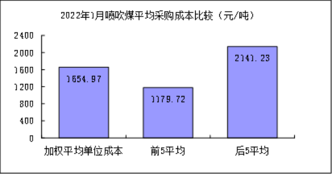 噴吹煤1月份加權平均折算成幹基的采購成本為1654.97元/噸,環比下降88.44元/噸,降幅為5.07%;同比升高666.55元/噸,升幅為67.44%。