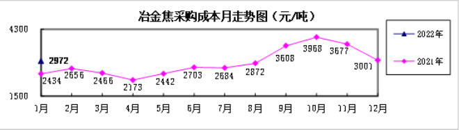 冶金焦1月份加權平均折算成幹基的采購成本2971.66元/噸,環比下降29.13元/噸,降幅為0.97%;同比升高537.58元/噸,升幅為22.09%。
