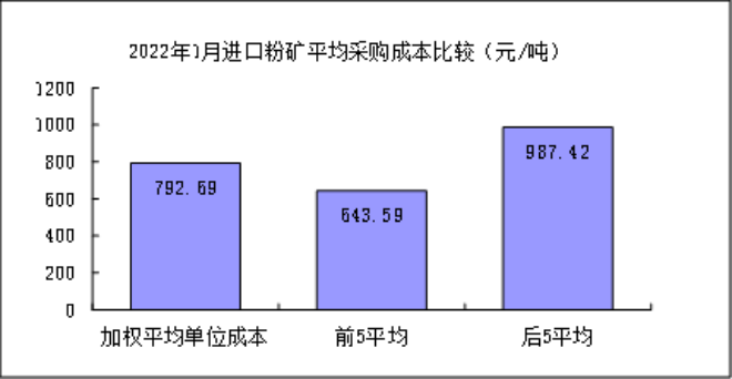 1月對標企業進口粉礦折算成62%品位的平均采購成本為792.69元/噸,成本最低的前5家企業的加權平均采購成本為643.59元/噸,比對標企業平均采購成本低149.10元/噸,低於平均采購成本18.81%;而采購成本最高的5家企業加權平均采購成本為987.42元/噸,比對標企業平均采購成本高194.73元/噸,高於平均采購成本24.57%。