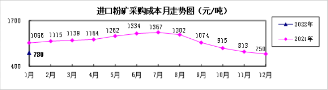 進口粉礦1月份加權平均采購成本780.09元/噸,環比升高29.76元/噸,升幅為3.97%;同比下降286.02元/噸,降幅為26.83%。