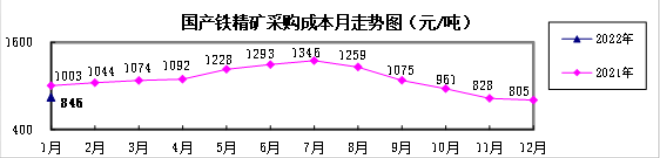國產鐵精礦(幹基)1月份加權平均采購成本為845.96元/噸,環比升高41.12元/噸,升幅為5.11%;同比下降157.25元/噸,降幅為15.67%。