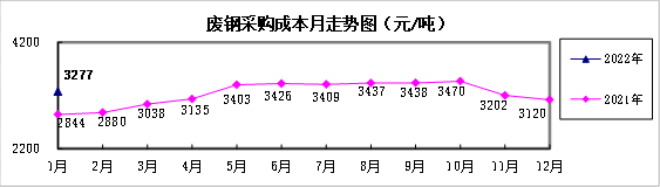 廢鋼1月份加權平均采購成本為3276.77元/噸,環比升高156.47元/噸,升幅為5.01%;同比升高432.39元/噸,升幅為15.20%。