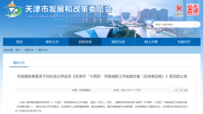 3月11日,天津市發展改革委官網發布關於向社會公開征求《天津市“十四五”節能減排工作實施方案(征求意見稿)》意見的公告(以下簡稱公告)。