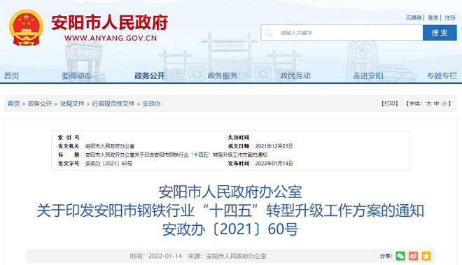 近日,安陽市人民政府網站發布了印發了《安陽市鋼鐵行業“十四五”轉型升級工作方案》(以下簡稱“《方案》”)。《方案》對安陽市鋼鐵行業“十三五”時期取得的成績予以肯定,並對未來“十四五”發展進行規劃,提出要求與具體措施。