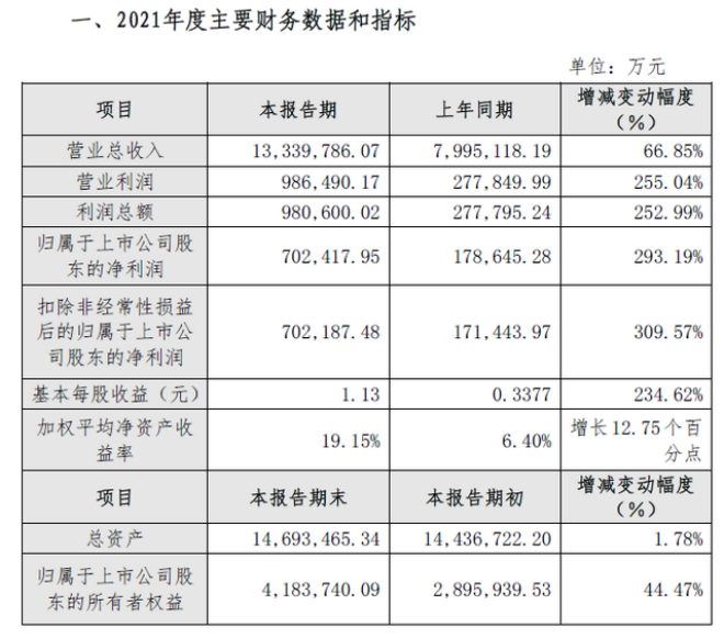 首鋼股份發布的業績快報顯示,2021年營業總收入1333.98億元,比上年同期增長66.85%;歸屬於上市公司股東的淨利潤70.24億元,同比增長293.19%,這是首鋼股份自1999年A股上市以來的最好業績。