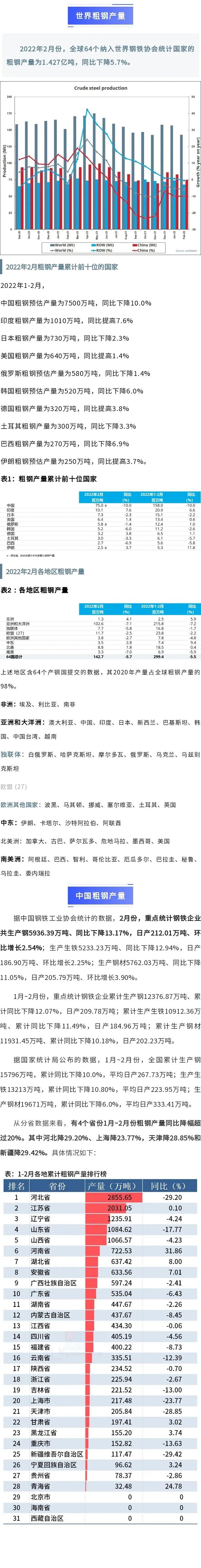 2月全球粗鋼產量1.427億噸,同比下降5.7%;1~2月中國4省市粗鋼降幅超過20%