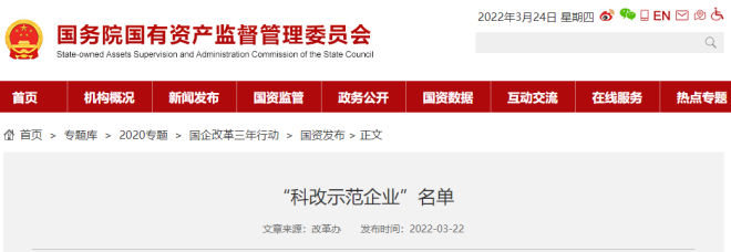 3月22日,國務院國有資產監督管理委員會網站發布了《“科改示範企業”名單》以下簡稱“《名單》”。