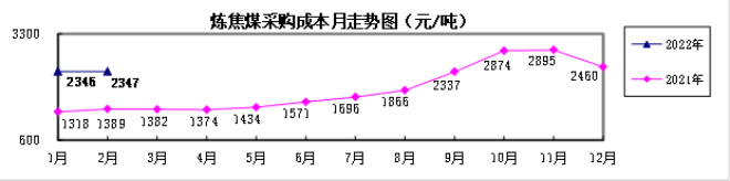對標企業煉焦煤2月份加權平均折算成幹基的采購成本為2346.97元/噸,環比升高0.59元/噸,升幅為0.02%。1-2月累計平均折算成幹基的采購成本為2354.54元/噸,同比升高1000.91元/噸,升幅為73.94%。