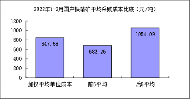 1-2月對標企業國產鐵精礦折算成62%品位的平均采購成本為847.58元/噸,成本最低的前5家企業的加權平均采購成本為683.26元/噸,比對標企業平均采購成本低164.32元/噸,低於平均采購成本19.39%;而采購成本最高的5家企業的加權平均采購成本為1054.09元/噸,比對標企業平均采購成本高206.50元/噸,高於平均采購成本24.36%。