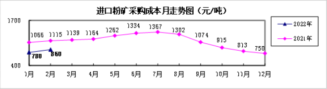 進口粉礦2月份加權平均采購成本859.66元/噸,環比升高79.56元/噸,升幅為10.20%。1-2月累計平均采購成本為811.65元/噸,同比下降276.62元/噸,降幅為25.42%。