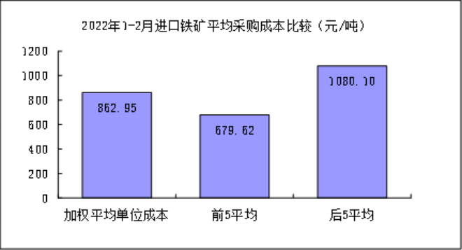 1-2月對標企業進口粉礦折算成62%品位的平均采購成本為825.34元/噸,成本最低的前5家企業的加權平均采購成本為669.60元/噸,比對標企業平均采購成本低155.74元/噸,低於平均采購成本18.87%;而采購成本最高的5家企業加權平均采購成本為1033.00元/噸,比對標企業平均采購成本高207.66元/噸,高於平均采購成本25.16%。