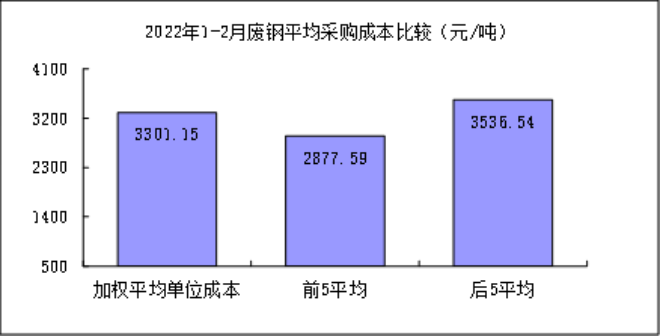 1-2月對標企業廢鋼平均采購成本最低的前5家企業的加權平均采購成本為2877.59元/噸,比對標企業平均采購成本低423.55元/噸,低於平均采購成本12.83%;而采購成本最高的5家企業加權平均采購成本為3536.54元/噸,比對標企業平均采購成本高235.40元/噸,高於平均采購成本7.13%。
