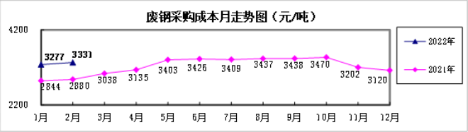 廢鋼2月份加權平均采購成本為3330.78元/噸,環比升高54.02元/噸,升幅為1.65%。1-2月累計平均采購成本為3301.15元/噸,同比升高445.12元/噸,升幅為15.59%。