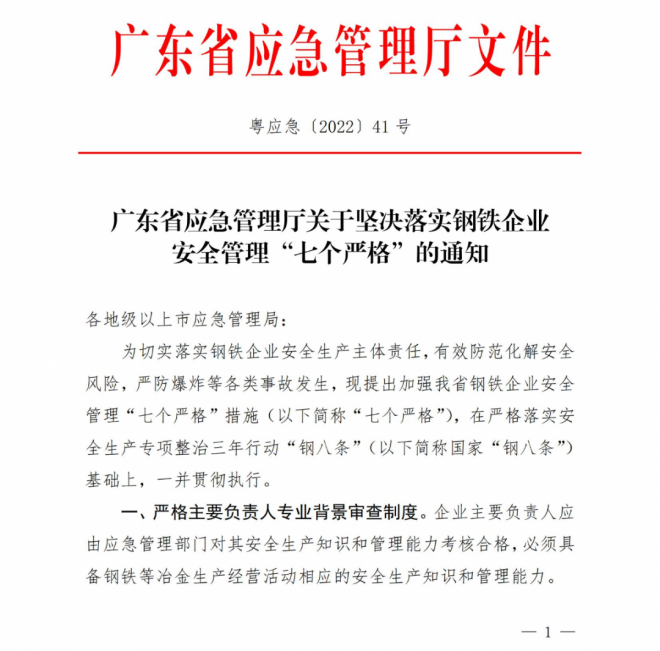 近日,廣東省應急管理廳下發了關於堅決落實鋼鐵企業安全管理“七個嚴格”的de通tong知zhi。通tong知zhi提ti到dao,為wei切qie實shi落luo實shi鋼gang鐵tie企qi業ye安an全quan生sheng產chan主zhu體ti責ze任ren,有you效xiao防fang範fan化hua解jie安an全quan風feng險xian,嚴yan防fang爆bao炸zha等deng各ge類lei事shi故gu發fa生sheng,現xian提ti出chu加jia強qiang廣guang東dong省sheng鋼gang鐵tie企qi業ye安an全quan管guan理li“七個嚴格”措施(以下簡稱“七個嚴格”),在嚴格落實安全生產專項整治三年行動“鋼八條”(以下簡稱國家“鋼八條”)基礎上,一並貫徹執行。