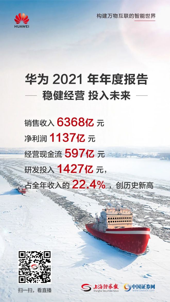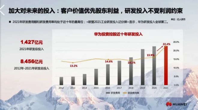 麵向未來,華為持續加大研發投入。據孟晚舟介紹,2021年公司研發投入1427億元,占全年收入的22.4%。2011年至2021年,華為累計研發費用超過8450億元。