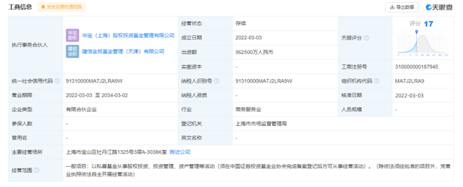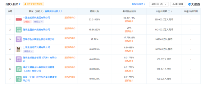 天眼查工商信息顯示,該合夥企業由中國寶武鋼鐵集團有限公司出資29.99億元;建信金融資產投資有限公司出資11.24億元;國家綠色發展基金股份有限公司出資9.99億元;上海寶恒經濟發展有限公司出資5億元;建信金投基金管理(天津)有限公司、綠色發展基金私募股權投資管理(上海)有限公司、華寶(上海)股權投資基金管理有限公司各出資100萬元。