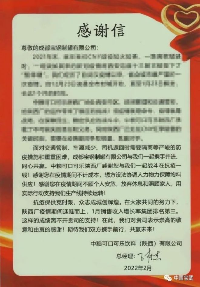 在雙方的共同努力下,中糧可口可樂(陝西)1月份銷售收入增長率名列集團第三名,實現了抗擊疫情和生產銷售“兩不誤”。由此,該客戶向成都寶鋼製罐發來感謝信,對危難之際的材料保供表達感激之情。