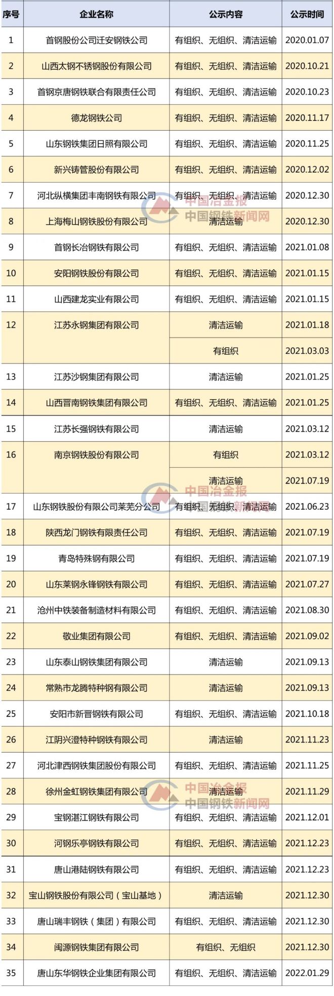 據中國鋼鐵工業協會網站顯示,目前已有35家鋼企完成超低排放改造公示,具體情況整理如下——