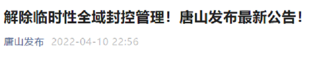 4月10日,從唐山發布公眾號獲悉,唐山市自4月11日零時起,解除市域內臨時性封控管理,逐步有序恢複正常生產生活秩序。