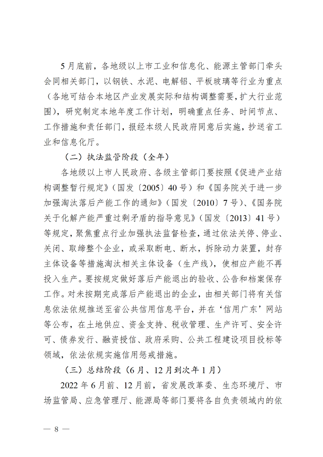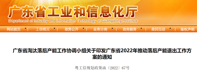 近日,廣東省工信廳網站發布了廣東省淘汰落後產能工作協調小組關於印發廣東省2022年推動落後產能退出工作方案的通知。《廣東省2022年推動落後產能退出工作方案》(以下簡稱《方案》)提出,以鋼鐵、水泥、電解鋁、平板玻璃等行業為重點,通過完善綜合標準體係,嚴格常態化執法和強製性標準實施,落實部門聯動和地方責任,深入推進市場化、法治化、常態化工作機製,促使一批能耗、環保、安全、技術達不到標準和生產不合格產品或淘汰類產能,依法依規關停退出。