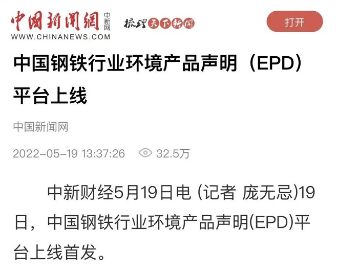 5月19日,中國新聞網發布了《鋼鐵行業環境產品聲明(EPD)平台上線》相關報道。