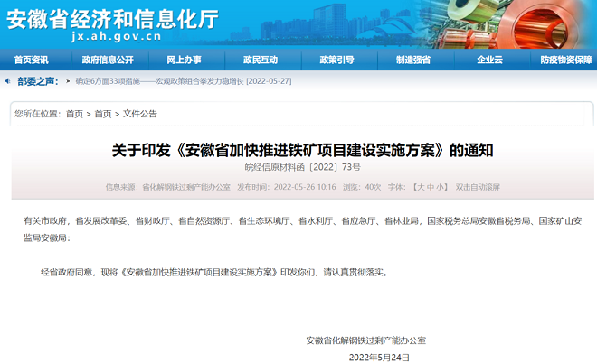 根據國家鋼鐵煤炭行業化解過剩產能和脫困發展工作部際聯席會議辦公室《關於加快推進國內鐵礦項目建設的通知》(發改辦產業〔2022〕255號)精神,為加快推進我省鐵礦項目建設,提高鐵礦資源自主保障能力,製定本方案。
