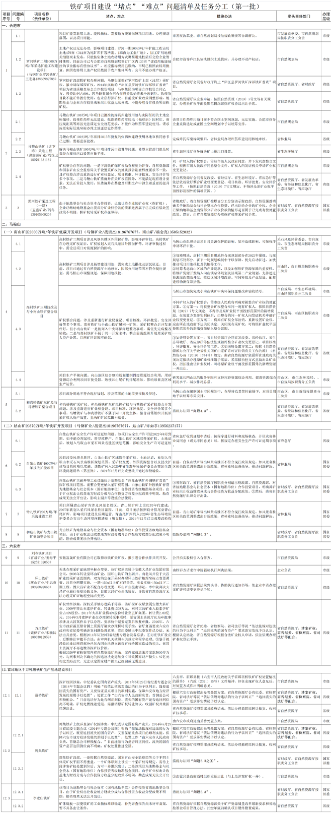 《方案》還附上了安徽省鐵礦建設項目基本情況,以及鐵礦項目建設“堵點”“難點”問題清單及任務分工(第一批)。