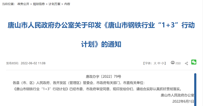 6月2日,唐山市人民政府網站發布了關於印發《唐山市鋼鐵行業“1+3”行動計劃》(以下簡稱《行動計劃》)的通知,並對其進行了政策解讀。《行動計劃》提出,推動區域內產品同質化企業聯合重組,構建集團化管控、市場化運作、國際化發展的高效運行機製,打造國內民營鋼鐵行業標杆。盡快形成以首鋼(京唐、遷鋼)、唐鋼新區兩家大型鋼鐵集團為主導,沿海、遷安、灤州、遷西(遵化)4大片區為支撐,產能規模達到500萬噸左右的8家地方大型鋼鐵聯合企業為重點的“248”鋼鐵產業新格局。