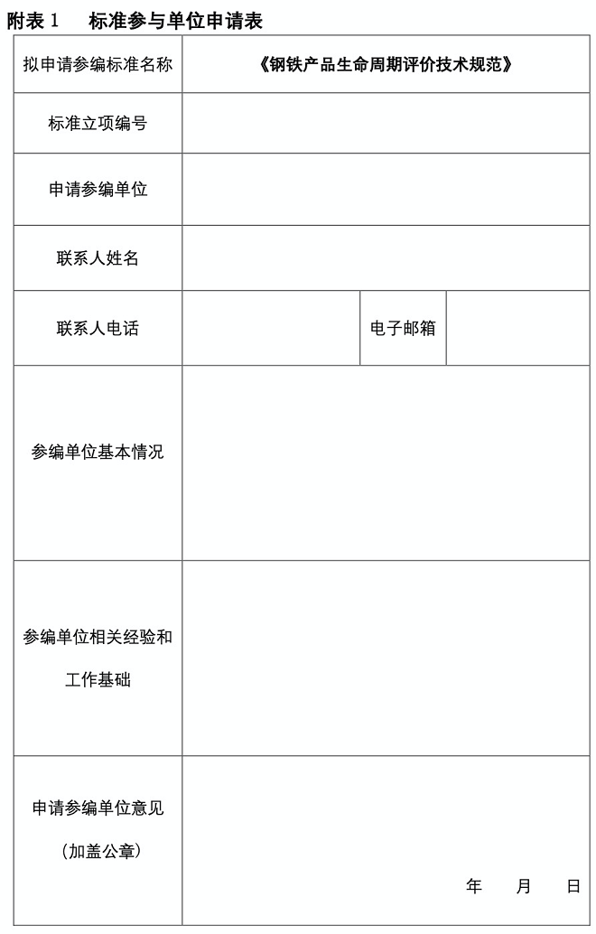 中國金屬學會現繼續麵向會員單位及相關單位公開征集鋼鐵產品全生命周期標準製訂參與單位。參與單位申請表見附表1。
