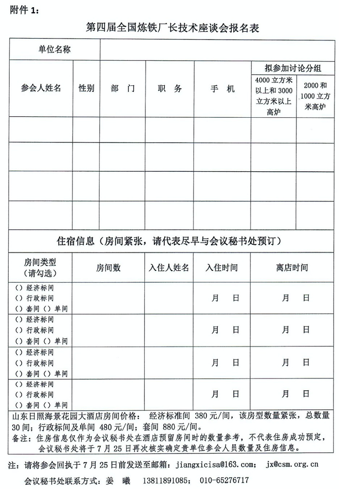 附件1. 第四屆全國煉鐵廠長技術座談會報名表