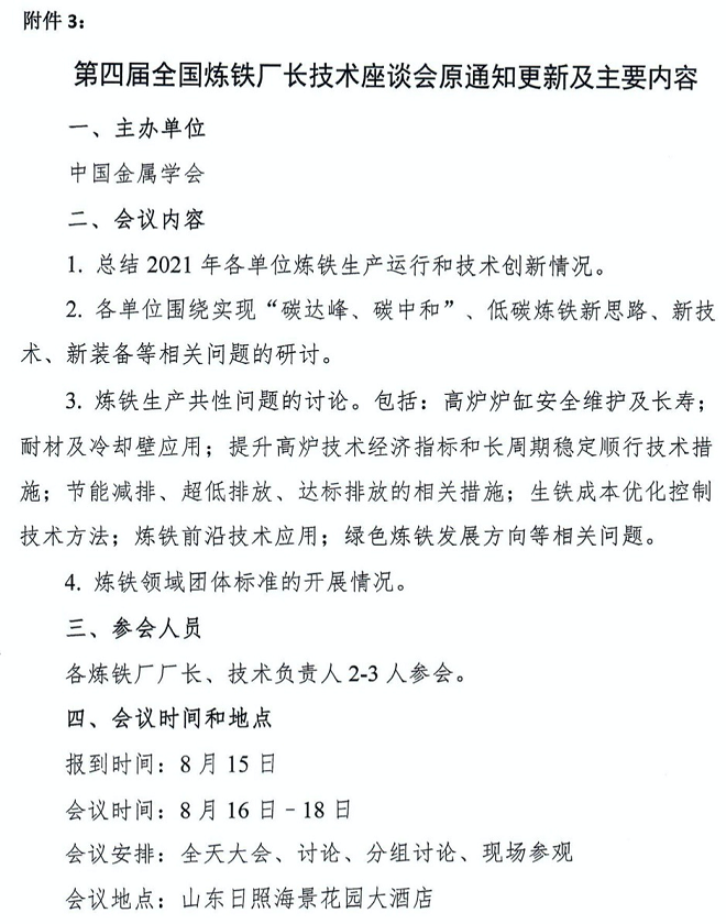 附件3. 第四屆全國煉鐵廠長技術座談會原通知更新及主要內容