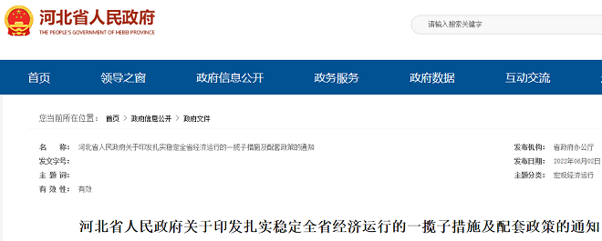 為(wei)落(luo)實(shi)全(quan)國(guo)穩(wen)住(zhu)經(jing)濟(ji)大(da)盤(pan)電(dian)視(shi)電(dian)話(hua)會(hui)議(yi)精(jing)神(shen)和(he)國(guo)務(wu)院(yuan)紮(zha)實(shi)穩(wen)住(zhu)經(jing)濟(ji)的(de)一(yi)攬(lan)子(zi)政(zheng)策(ce)措(cuo)施(shi),河(he)北(bei)省(sheng)製(zhi)定(ding)了(le)紮(zha)實(shi)穩(wen)定(ding)全(quan)省(sheng)經(jing)濟(ji)運(yun)行(xing)的(de)一(yi)攬(lan)子(zi)措(cuo)施(shi)及(ji)20個配套政策。近日,河北省人民政府網站發布《關於印發紮實穩定全省經濟運行的一攬子措施及配套政策的通知》,共包含1個總文件和20個配套文件。
