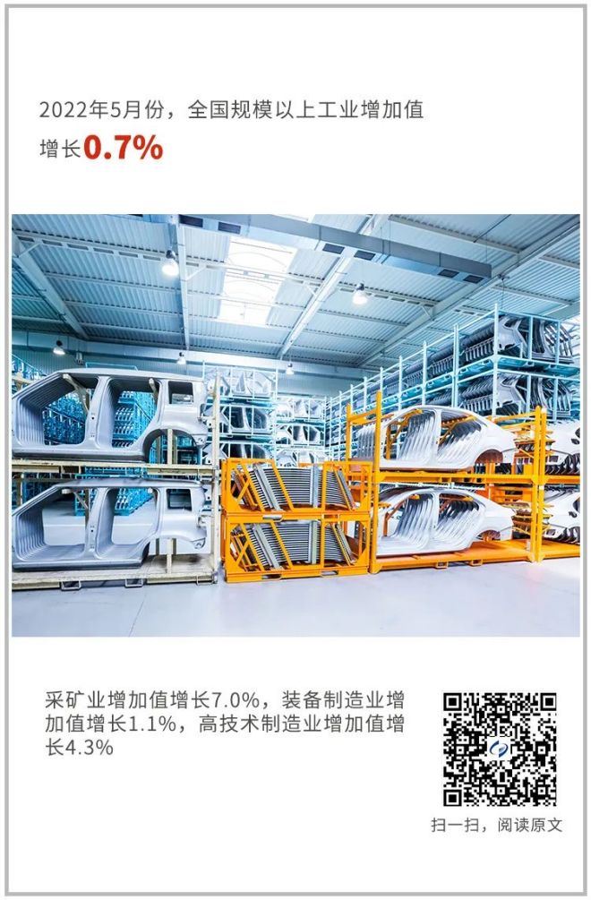 5月份,全國規模以上工業增加值同比增長0.7%,4月份為下降2.9%;環比增長5.61%。分三大門類看,采礦業增加值同比增長7.0%,製造業增長0.1%,電力、熱力、燃氣及水生產和供應業增長0.2%。